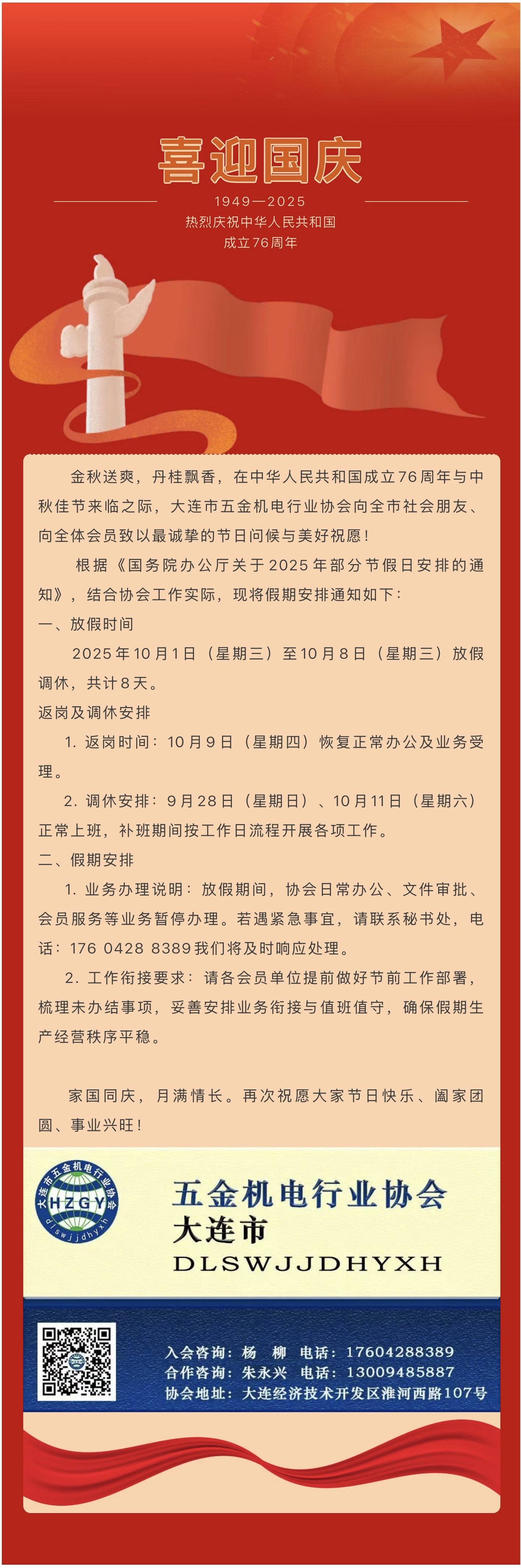大连市五金机电行业协会祝全市人民国庆、中秋佳节快乐!
